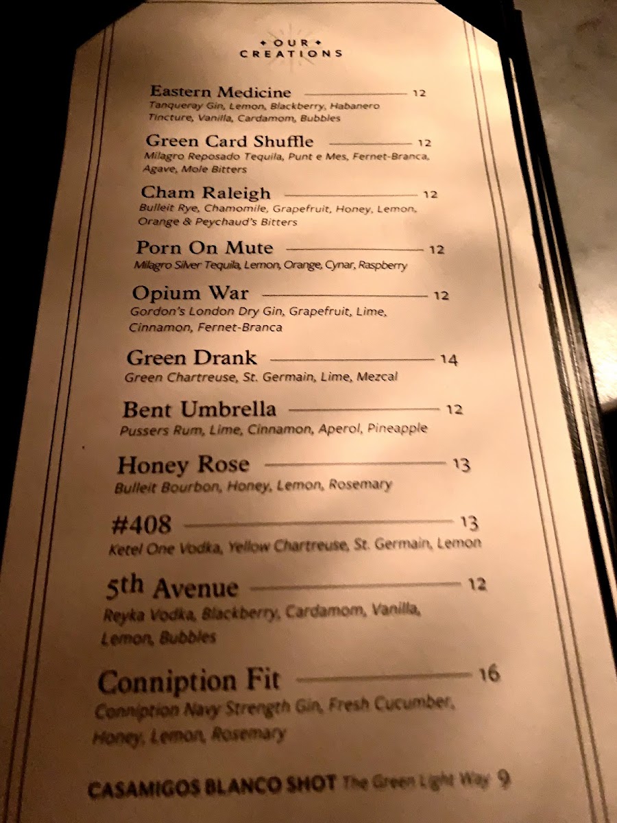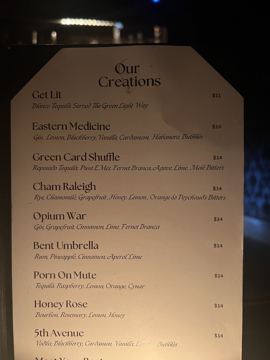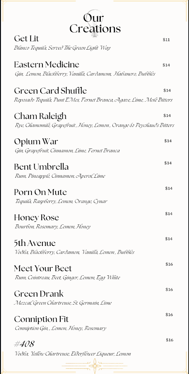 Introducing the menu at The Green Light, a hidden gem in downtown Raleigh, is a delightful experience for anyone seeking an enchanting night out. Located at 108 E Hargett St, this cozy speakeasy boasts an ambiance highlighted by low lighting and intimate settings, creating an inviting atmosphere perfect for socializing or a romantic evening.